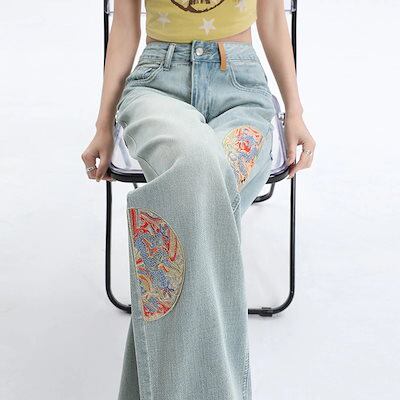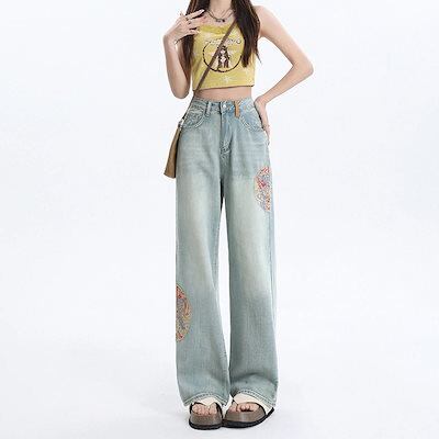 風刺繍 デニムボトムス ワイドパンツ ジーンズ レディース ストレートパンツ ゆ ったり 快適性 着痩せ ハイウェスト ジョガーパンツ モップパンツ