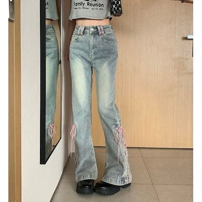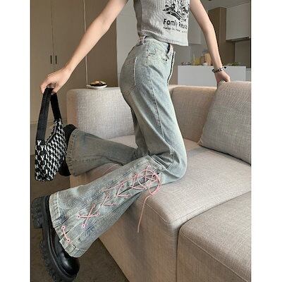 大きいサイズ アメリカンスタイル レトロ ストラップ フレア ジーンズ レディース 韓版 ファット mm ハイウエスト スリム ストレート ワイドレッグ パンツ 母の日