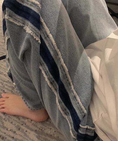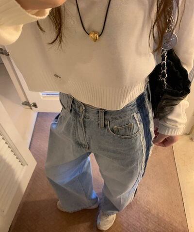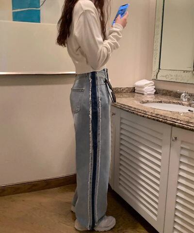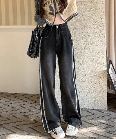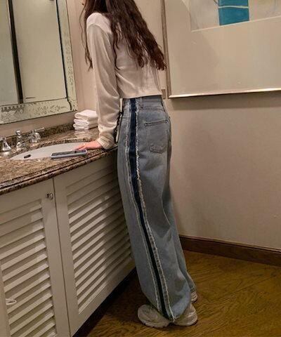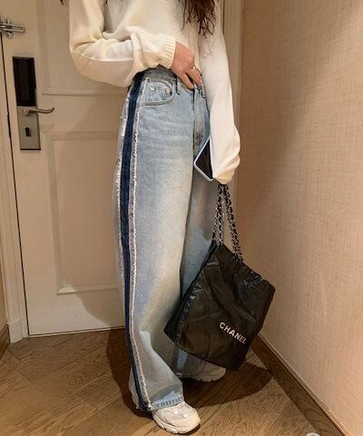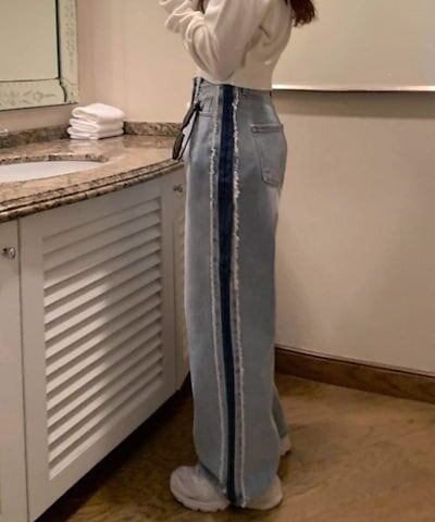 デニムパンツ レディース デニム ジーンズ サイドライン 配色 フリンジ パンツ ワイド ハイウエスト ストレート ジーンズ ジーパン ストレートパンツ ストレートデニム ボトムス 太もも 体型カバー