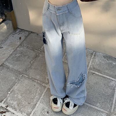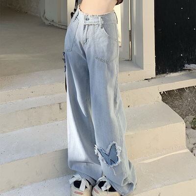 春秋 ワイドパンツ デニムボトムス レディース 蝶々 ハイウェスト ゆったり ストレート カジュアル ジョガーパンツ