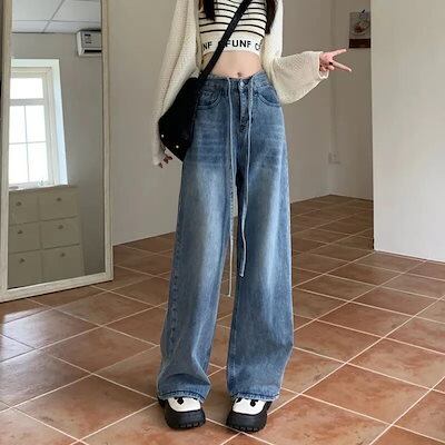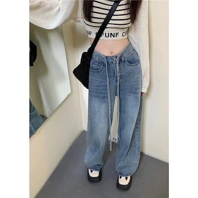 春 夏レトロ ジーンズ レディース 新作 ハイウエスト ワイドパンツ スリム見え オールマッチ ストレート ドレープ感 流行りひんやりボトムス