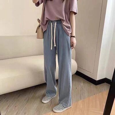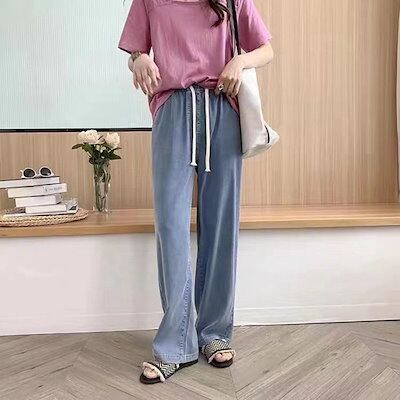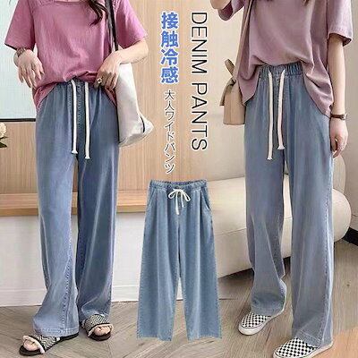 イージーパンツ 大きいサイズ ハイウェスト ロングパンツ レディース ひんやり ストレートパンツ ゆったり ウェスト紐 デニムパンツ