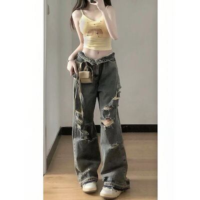 レトロでレトロなデザイン感ギャルダメージジーンズレディース夏ins新作スリムストレートワイドレッグモップパンツ