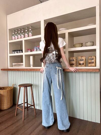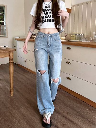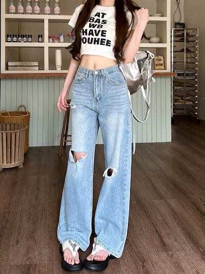 ゆったりストレートの穴あきデニムパンツレディースデザインバックポケットリボンワイドレッグモップパンツ