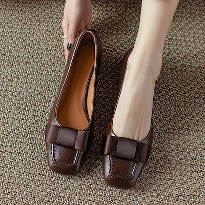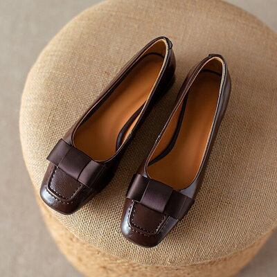 高見えデザイン レトロ スクエアトゥ リボン付き ローヒール パンプス