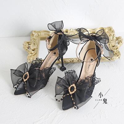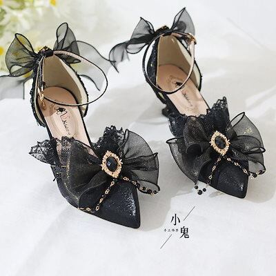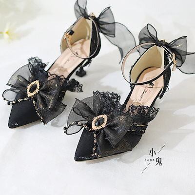 エレガントロリータゴシックダークリボンレースハイヒールポインテッドトゥ大人結婚式ローシューズピンヒールシングルシューズ