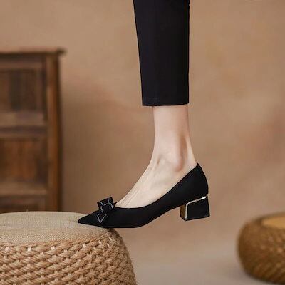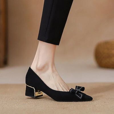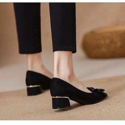 パンプス ヒールパンプス 黒のシングルシューズ25リボンの中ヒールの先が尖っている柔らかい底の浅い職業の太いヒールの仕事のハイヒール パンプス スタイルアップヒールパンプス スタイ