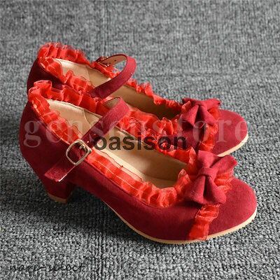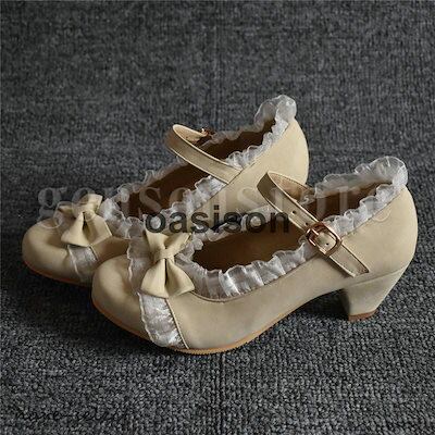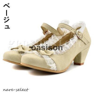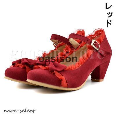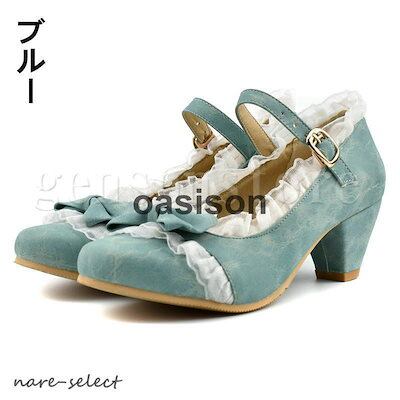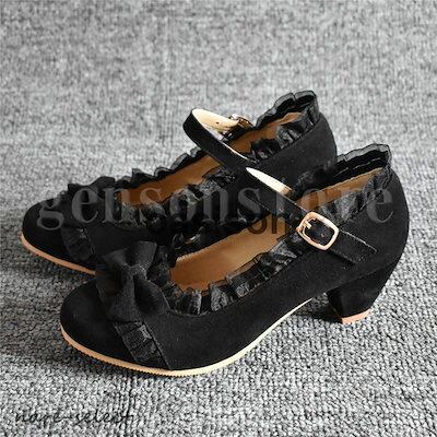 パンプス ストラップ ロリータ靴 ハイヒール フリル リボンシューズ レディース 太ヒール 疲れにくい 歩きやすい ラウンドトゥ 美脚 ダンス