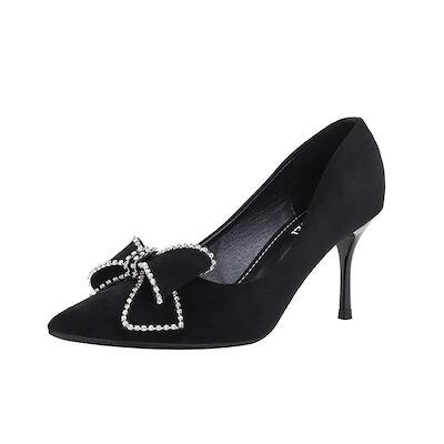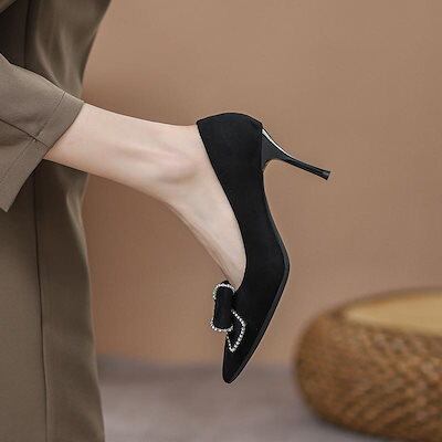 3日以内出荷パンプス 細ヒールハイヒールの本革新韓国版リボンスパイクシングルシューズ黒のソフトソールワークシューズ レディース 韓国ファッション