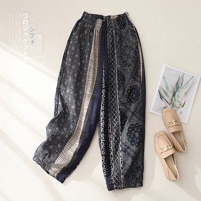 プリントパンツ大きいサイズレディース春服文芸風韓国ファッション ハイウエストカジュアルワイドパンツハーレムパンツ九分丈