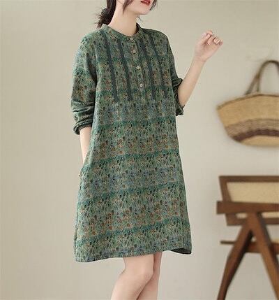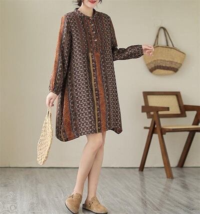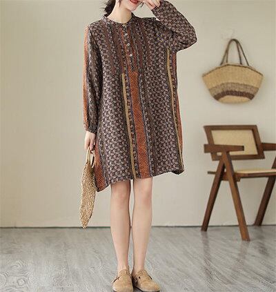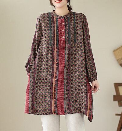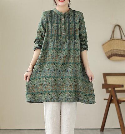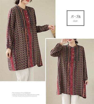 バンドカラー ブラウス 春夏 レディース 長袖 薄手 綿麻風 エスニック風 シャツブラウス レディース トップス チュニック プルオーバー カジュアル 春 夏 大人 柄 総柄 綿麻混 レトロ 大人可愛
