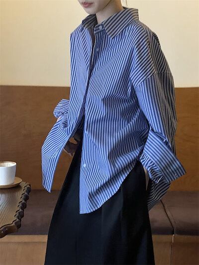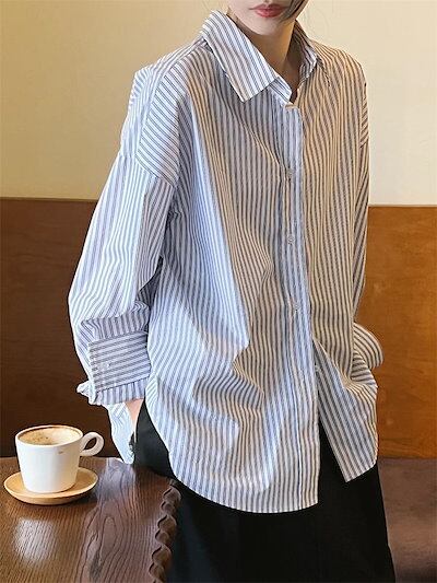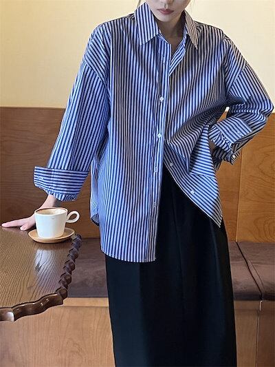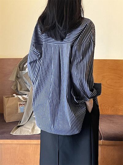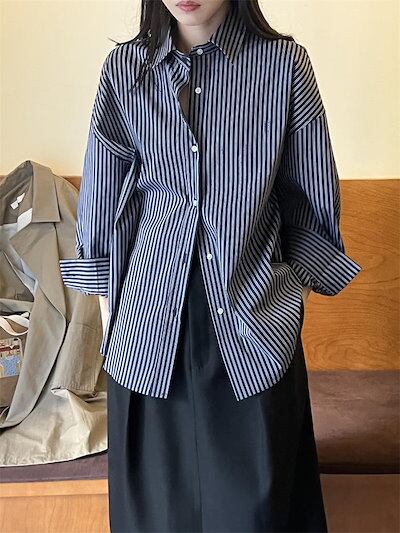 シャツ 長袖 レディース トップス ブラウス ミドル丈 羽織 ギャザー ストライプ柄 配色 シャツブラウス 柄シャツ ゆったり 体型カバー 大きいサイズ 大人カジュアル ベーシック オフィス 上品 モ