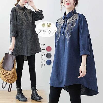 チュニック 長袖 春秋 ブラウス 刺繍 襟付き シャツブラウス 綿麻風 長袖シャツ リネン シャツ ロング丈 トップス レディース 大きいサイズ ロングシャツ 前後差 夏 無地 柄 ゆったり 着まわし