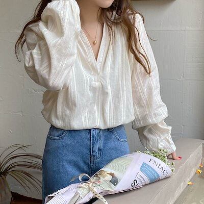 トップス レディース ブラウス 個性的 長袖 ヘンリーネック 透け感 ストライプ 柄 白 ベージュ S30%までに制限