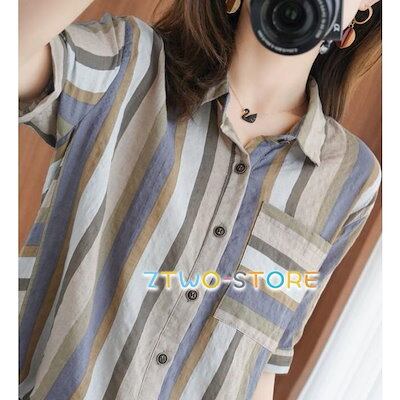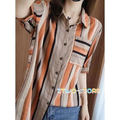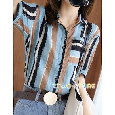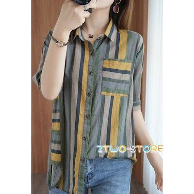 シャツ レディース 半袖 ストライプ 春 秋 トップス レギュラーカラー 襟付きシャツ ブラウス 柄シャツ ゆったり 大きいサイズ 3L 4L カジュアル