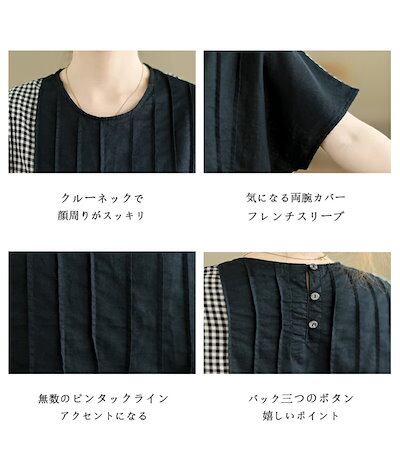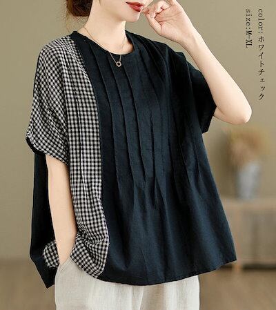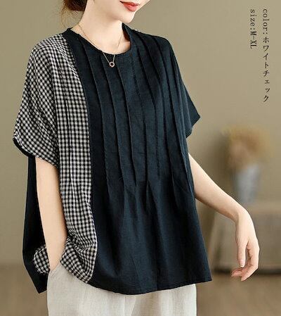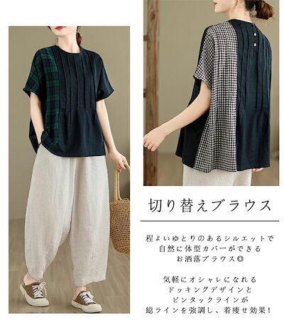 クルーネック ブラウス レディース おしゃれ 切り替え チェック柄 プルオーバー シャツ 半袖 カジュアル トップス ミドル丈 切替 シャツブラウス 春 夏 ピンタック チェック柄シャツ 柄 カジュア