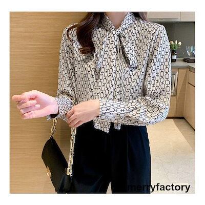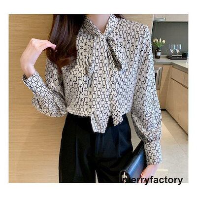 大人気 ボウタイ レトロ 柄 ブラウス 長袖 レディース トップス 上品 きれいめ 事務服 シャツ リボンタイ ボウタイブラウス リボンブラウス パーティー フォ