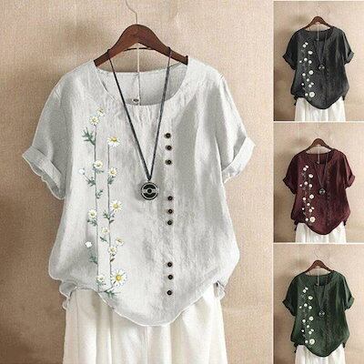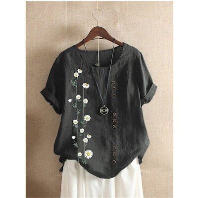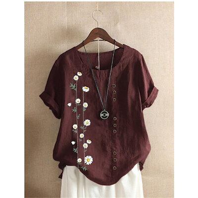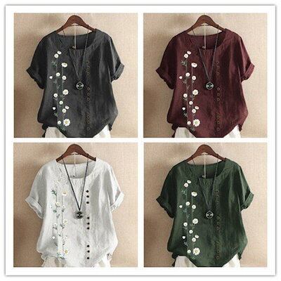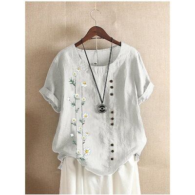 トップス シャツブラウス シャツ プルオーバー ブラウス レディース ロング丈 半袖 Uネック 花柄 柄 刺繍 綿混 通気性 大きいサイズ ゆったり 着痩せ 夏 30代