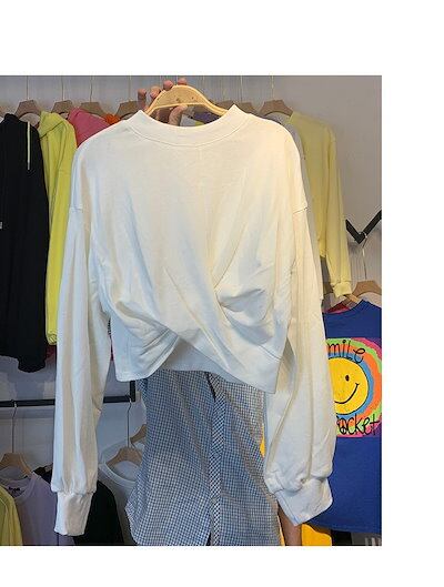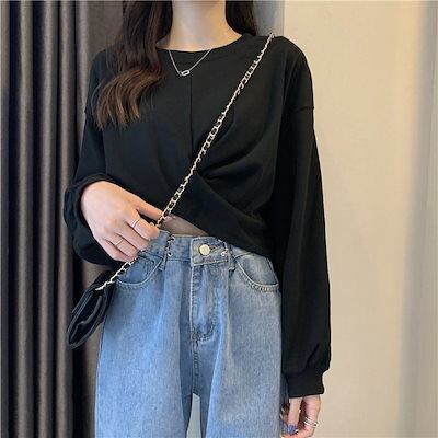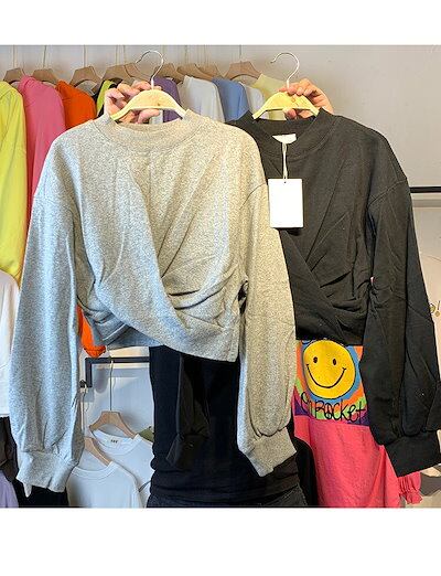 パーカー ゆったりスウェット 体型カバーチュニック 丸ネック 春 韓国ショット丈 イレギュラー シワ パーカーレイヤードトップスブラウス