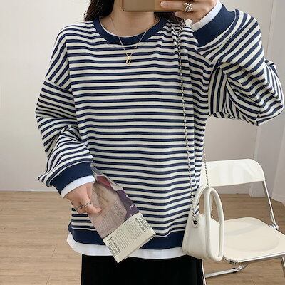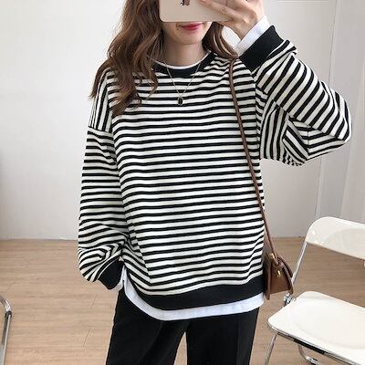パーカー ゆったりスウェット スウェット あったかルームウェア偽2ストライプの衛衣女性長袖春秋流ゆったりスリム丸首カバートップ
