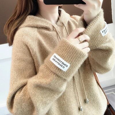 人気なリブニット 秋冬新作 ゆったり フード付きニットセーター レディース 韓国ファッション カジュアル 怠惰な風 快適 ニットトップス 暖かい ベーシックニット 百掛け インナー アンダーウェア