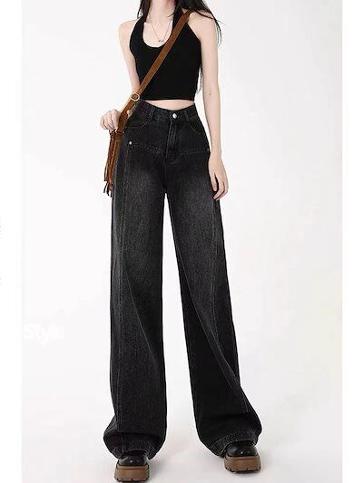 デニムパンツ ブラック ジーンズ レディース 春秋 ゆったり 薄手 ストレート ワイドパンツ モップパンツ