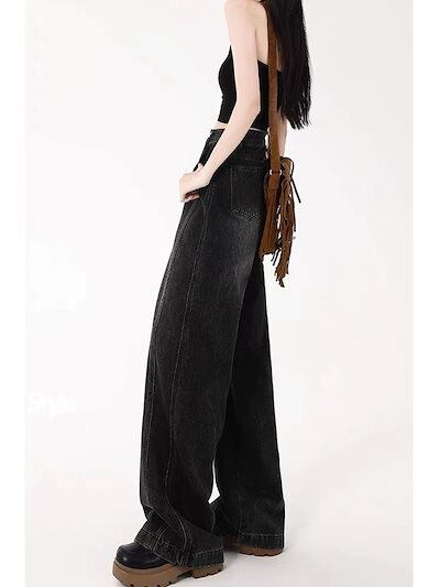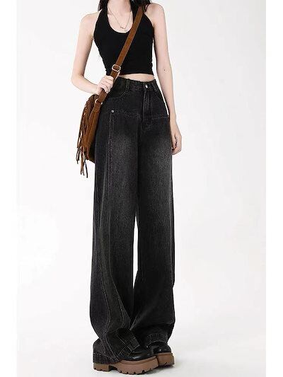 デニムパンツ ブラック ジーンズ レディース 春春 ゆったり 薄手 ストレート ワイドパンツ モップパンツ