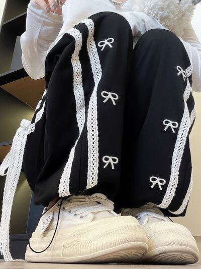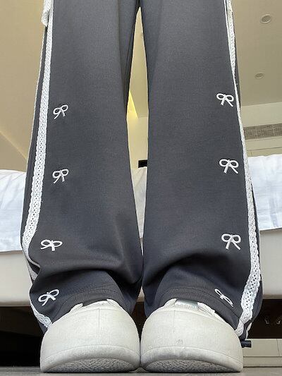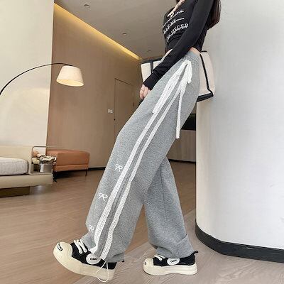 ワイドパンツ リボン刺繍ストライプワイドレッグパンツレディース春ハイウエストストレートドレープドラッグパンツ