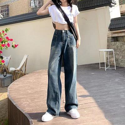 ジーンズ レディース ゆったり ストレートパンツ ハイウェスト 着痩せ ワイドパンツ モップパンツ ジョガーパンツ