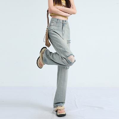 ダメージジーンズ レディース ハイウェスト ワイドパンツ 春夏 着痩せ ストレート モップパンツ