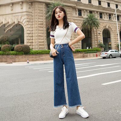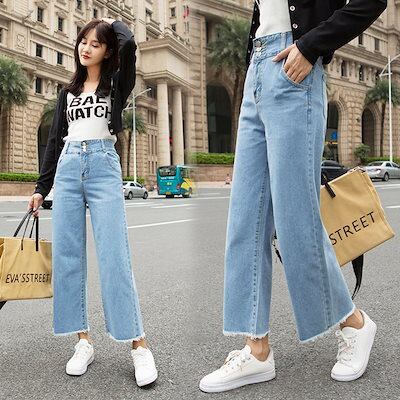 ハイウェスト ワイドパンツ ジーンズ レディース 春秋 九分丈パンツ ストレートパンツ ゆったり 着痩せ ロングズボン