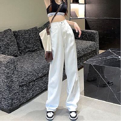 即納ホワイト ワイドパンツ レディース ハイウェスト 春 着痩せ ストレートパンツ ジーンズ