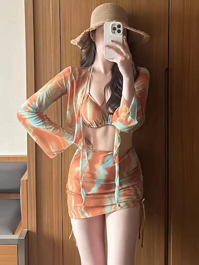 水着 韓国ファッションの水着 体型力バー レトロ水着4点セット長袖日焼け止め遮肉控えめ高級感アイランドリゾートスパ新作ビキニ 2025新作 レディース 水着orange