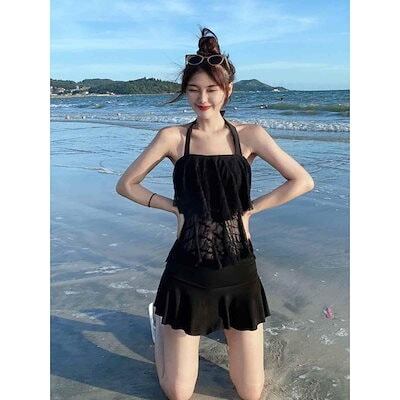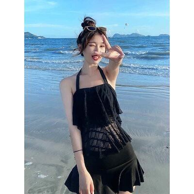 水着 韓国ファッションの水着 体型力バー レディース 水着 2025新作 水着夏純欲風控えめ小胸黒お腹を寄せて痩せ見えスカート風レース水着orange
