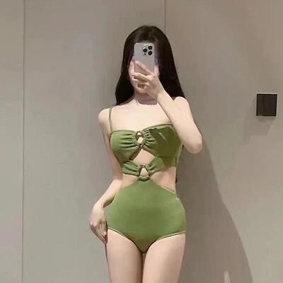 【満場時間限定】白と緑の三角連体水着がセクシーに見える純色透かし彫り露背リゾート水着ビーチ温泉 女の子 水着 レディース 可愛い 大きいサイズ 大人用 水着 体型カバー ラッシュガード スクール