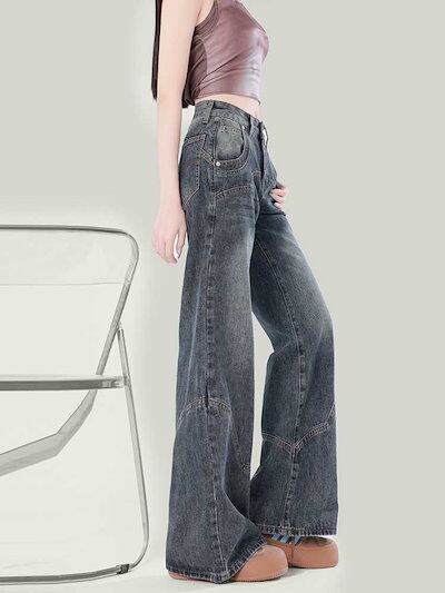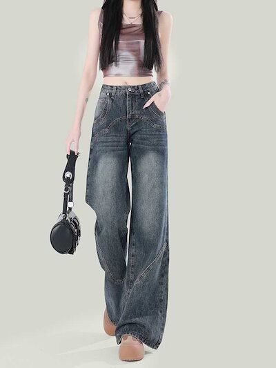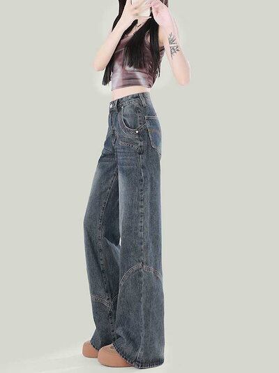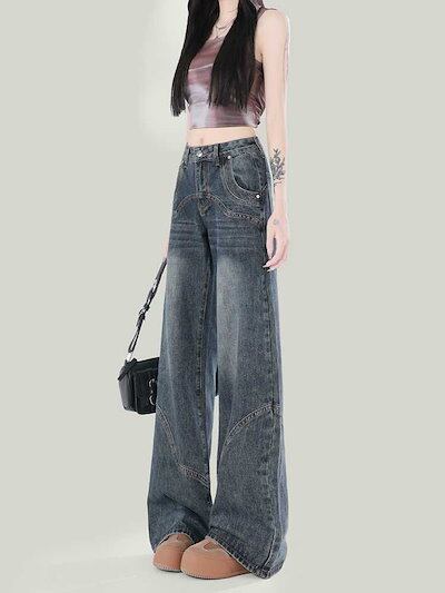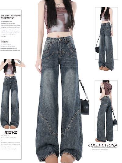 デニムパンツ アメリカンルーズパンツレディース春ジーンズ春春秋ゆったりストレートタイト大きい裾ドラッグパンツ