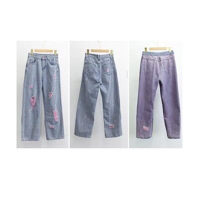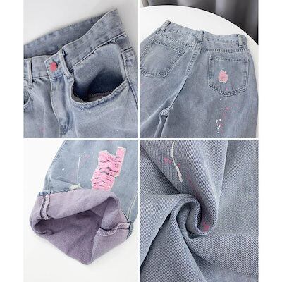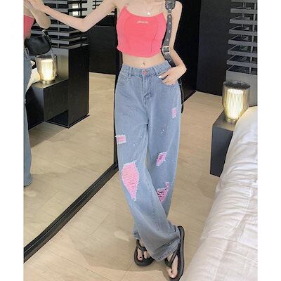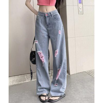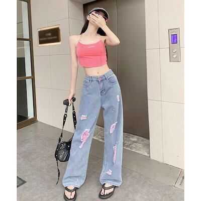 新追加 2025 新作春 脚長効果! デニムパンツ レディース ピンク ダメージデニムパンツ レディース