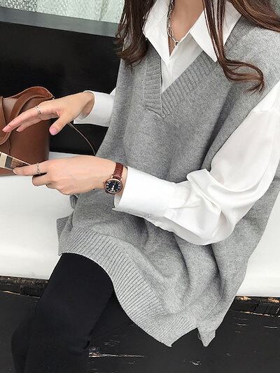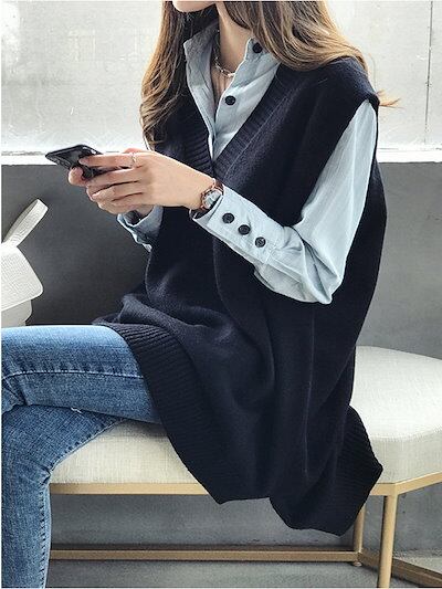 ニュースタイル オシャレ Vネックスリット ベスト 百掛け ゆったり 着痩せ トップス ニットベスト ロングベスト 通勤