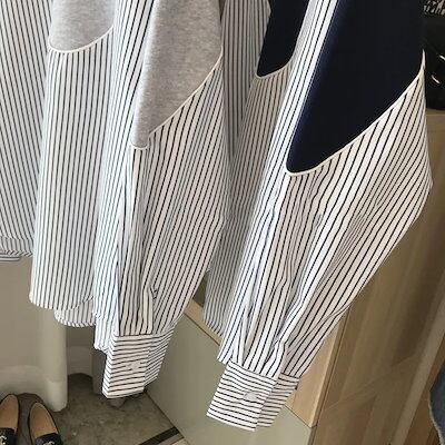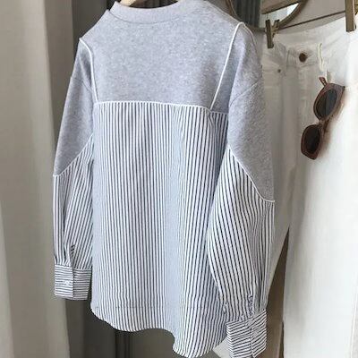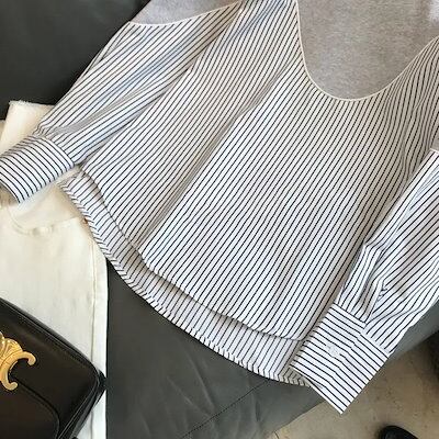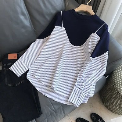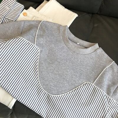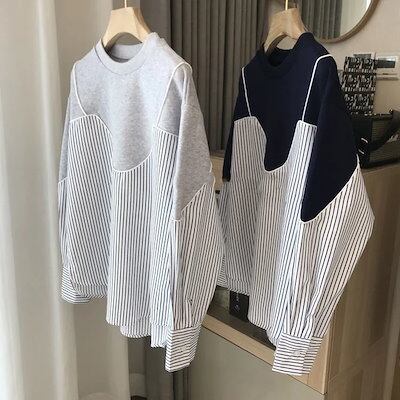 Tシャツ 韓国 カットソー シフォンブラウス ロンT トップス シャツ レディース 長袖 色切り替え スウエット ストライプシャツ チュニック ゆったり