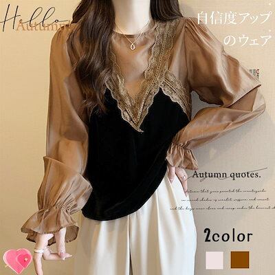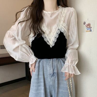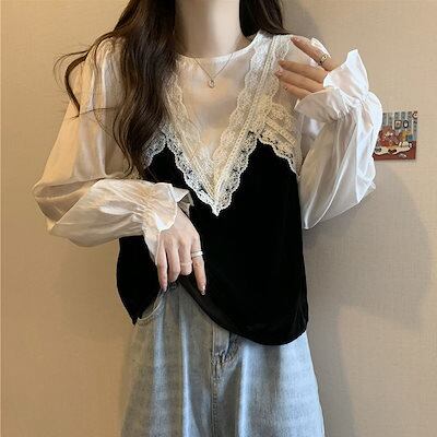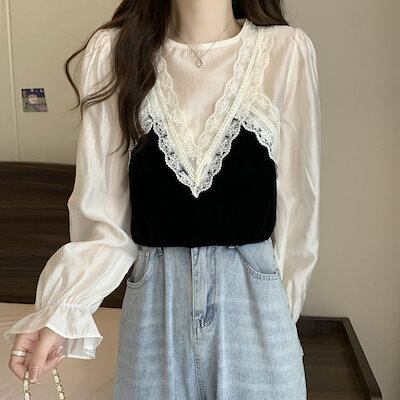 Tシャツ 韓国 韓国 新作 トップス シャツ 切り替え ブラウス アンダーウェア 長袖 フレアスリーブ 着やせ インナー 百掛け 流行り 高級感 フェイクレイヤード
