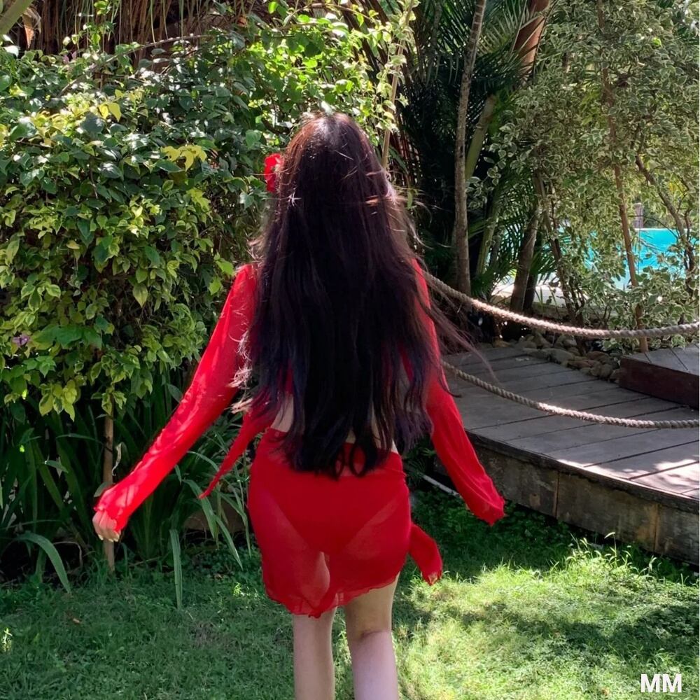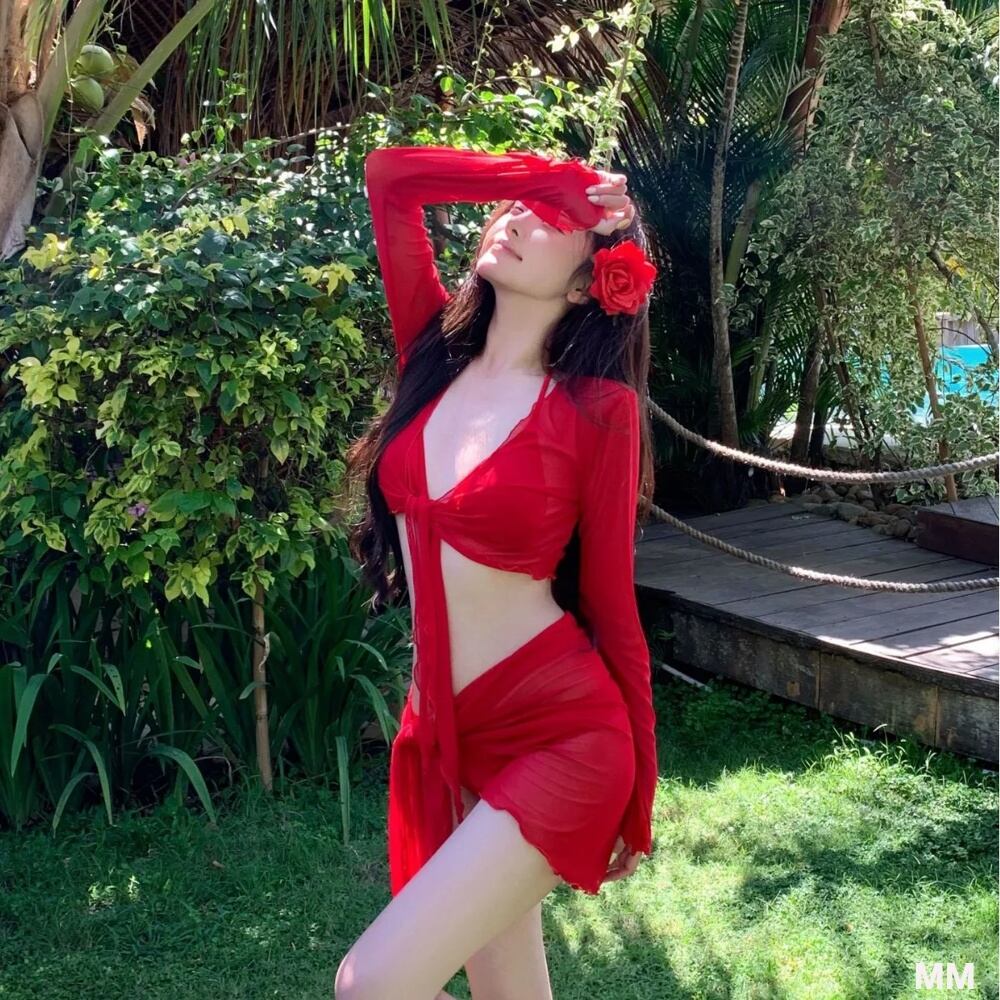 女性のためのセクシーな赤いホルターネックビキニ,ビーチとプールのための長袖水着,韓国のファッション,4ユニット 韓国系水着 セパレート水着 ワンピース水着 T240626160159_01