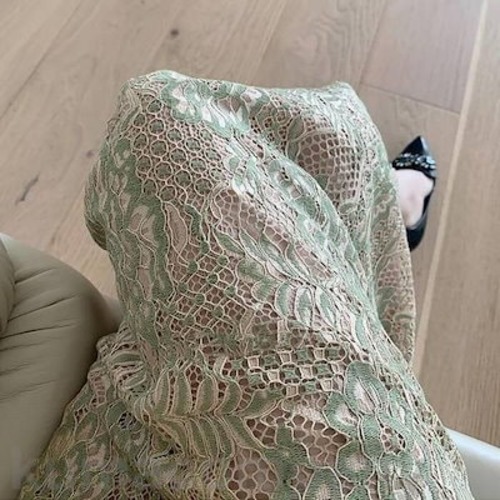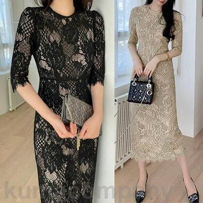結婚式 ワンピース 袖あり レース ドレス ミモレ丈 パーティー 総レース おしゃれ レディース 大人 可愛い フェミニン 五分袖 ワンピ 透け感 エレガント タイト スリム 二次会 お呼ばれ