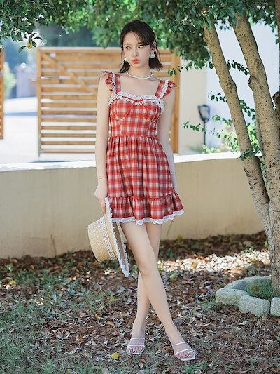 レトロフレンチレッドチェック柄水着レディースワンピーススカートコンサバガールやや太りmm大きいサイズスリムお腹カバー温泉新スタイル