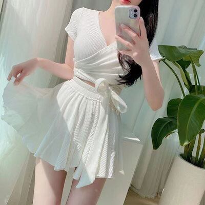 2024新作水着 韓国ファッション Swimwear 水着 レディース スプリット ハイウエスト 半袖 スリム スポーツ ボクサー ツーピース スーツ 学生 保守的 純粋な欲望 夏