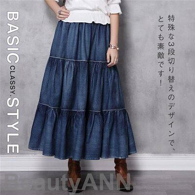新生活 スカート デニムスカート ロング丈 マキシ aライン ロングスカート ウエストゴム 冬 秋 レディース フレア 大きいサイズ ゆったり 着痩せ プレゼント ギフト