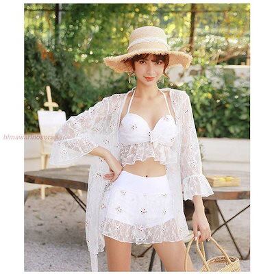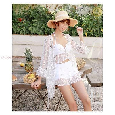 水着 レディース ビキニ 3点セット 水着 体型カバー ラッシュガードセット白 レース 水着 プリント 可愛い スイムウェア 水着