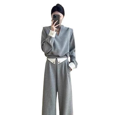 新作 二点セット スウェット ワイドパンツ 長袖スウェット 色切り替え Vネック 高級感  ハイウエスト ストレート パンツ 韓国ファッション 大きいサイズ ゆったり カジュアル
