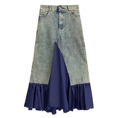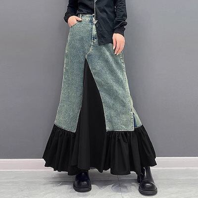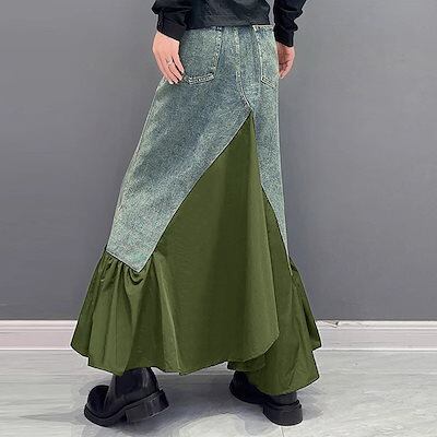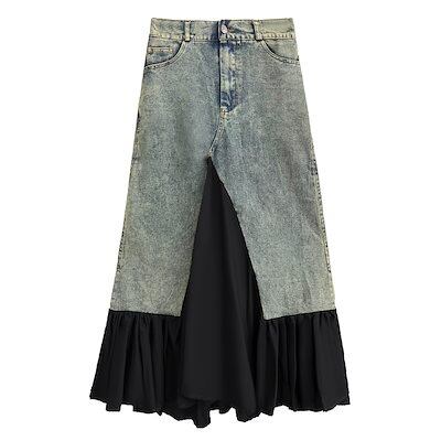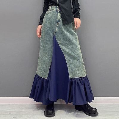 新作 高級感 デニムパンツ デニムスカート 切り替え レディース デザイン フレアスカート マキシスカート コントラストカラー 着やせ 韓国ファッション