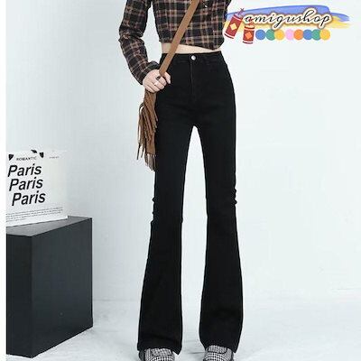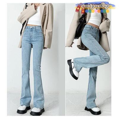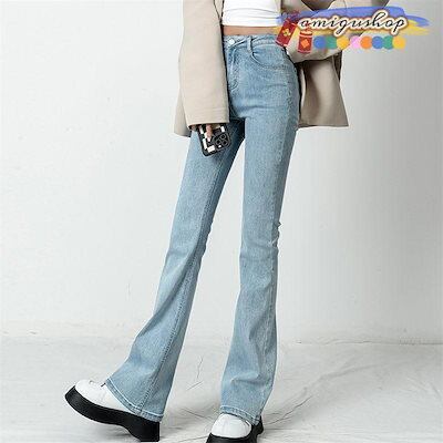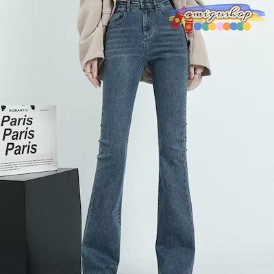 デニムパンツ レディース ジーンズ フレアパンツ ボトムス ハイウエスト ロング丈 カシュアル 体型カバー ゆったり 美脚 秋 細身 ストレッチ
