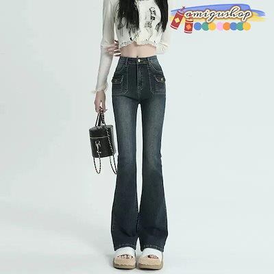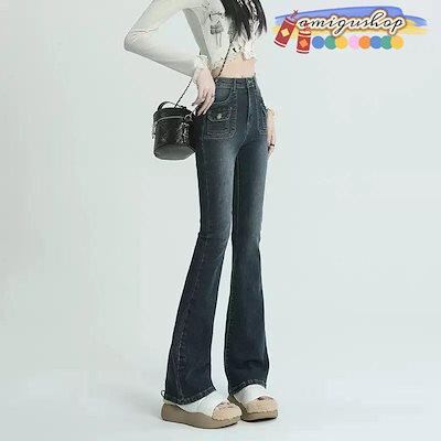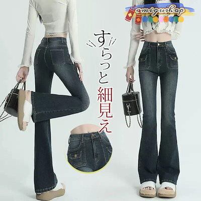 フレアパンツ レディース ジーンズ ズボン ボトムス ハイウエスト ロング丈 カシュアル 体型カバー 着痩せ 美脚 秋 細身 ストレッチ